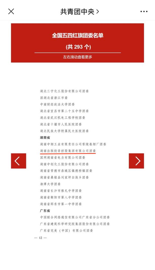 2022年是中國(guó)共青團(tuán)成立100周年。近日,共青團(tuán)中央作出表彰決定,授予293個(gè)團(tuán)組織全國(guó)五四紅旗團(tuán)委稱(chēng)號(hào),授予377個(gè)團(tuán)組織全國(guó)五四紅旗團(tuán)支部稱(chēng)號(hào),授予457人(含追授3人)全國(guó)優(yōu)秀共青團(tuán)員稱(chēng)號(hào),授予341人(含追授1人)全國(guó)優(yōu)秀共青團(tuán)干部稱(chēng)號(hào)。湖南出版投資控股集團(tuán)有限公司團(tuán)委榮獲全國(guó)五四紅旗團(tuán)委稱(chēng)號(hào)。